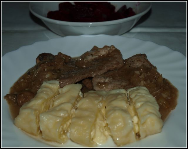 Sv.zrezki v šampinjonovi omaki, kuhani štruklji, rdeča pesa: