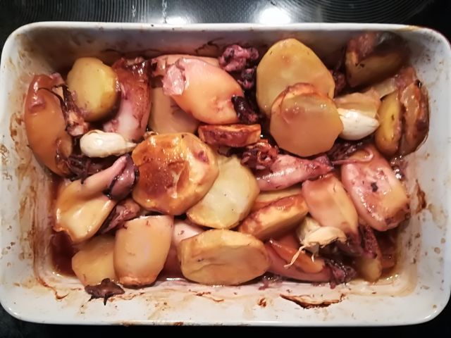 danes lignji s krompirjem iz pečice, mešana solata