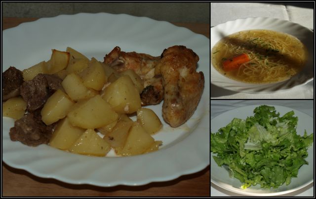 Goveja juhica; pečene perutničke, popečena govedina, krompir; zelena solata