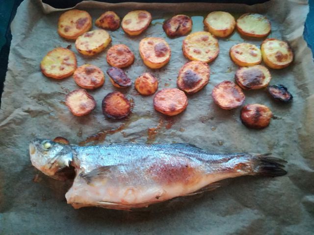 danes brancin in krompir iz pečice, mešana solata. Zraven sem naredila še špinačo s česnom, ampak mi je posodica s soljo v ponev padla