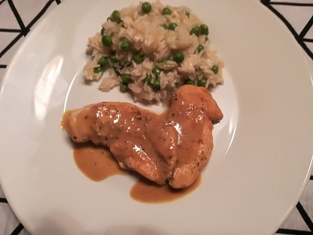 danes piščančji file v gorčični omaki, rizi bizi in mešana solata