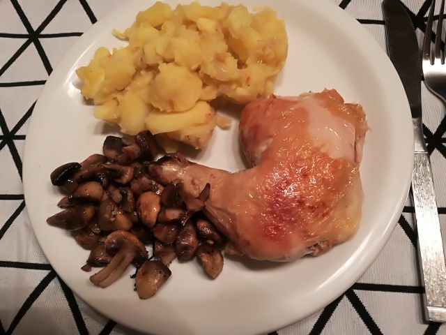 danes pečen piščanec, tenstan krompir in popečeni šampinjoni