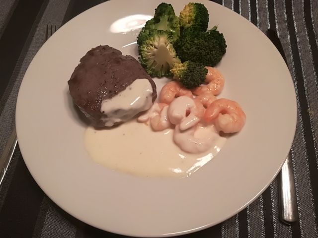 goveji biftek medium rare, popečene kozice, parmeznova omaka, na pari kuhan brokoli