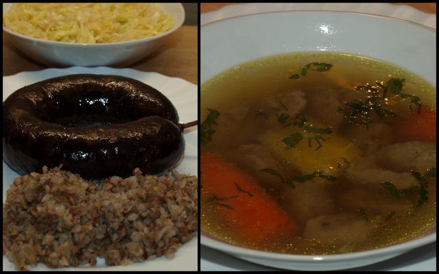 Goveje/piščančja juhica z jetrnimi knedli; krvavica, ajdova kaša s slanino; zelje na solato