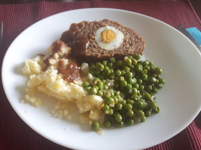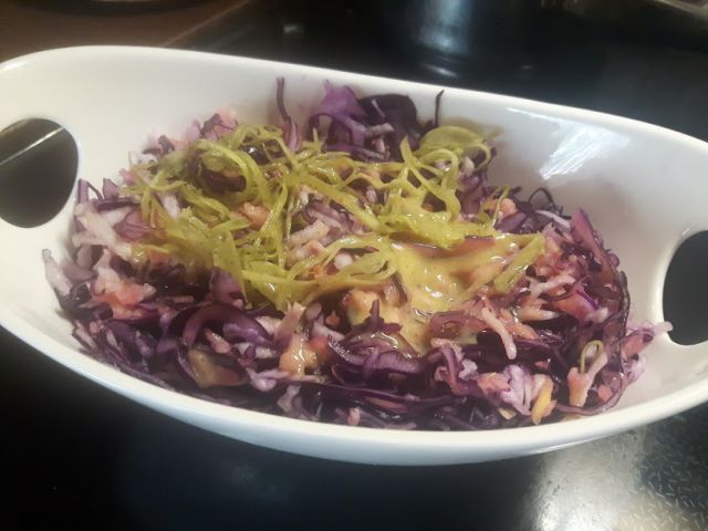 Včeraj stefanie pečenka, grašek in pire, zraven malo omake, nastale iz soka od pečenja in zelenjave,ki se je pekla v pekaču pod pečenko. Zraven solata iz rdečega zelja, sveže repe, zelene, jabolk, s prelivom iz gorčice, olivnega olja, začimb in limoninega soka.
