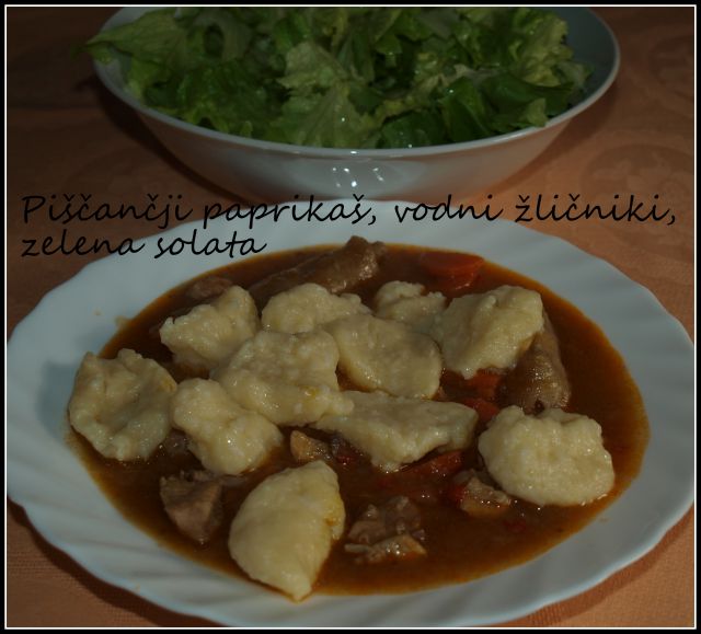 Mi pa danes, juho eni s palačinkami, eni z zdrobovmi cmoki. Kurji trakci v omaki s porom in zemfom, pa zelena solata z paradižnikom.