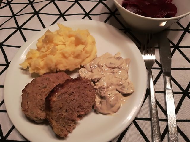 danes mesna štruca, pire krompir, gobova omaka in pesa v solati