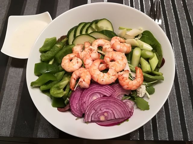 danes podobno, kot je imela Trixi včeraj, mešana solata s popečenimi kozicami in prelivom iz grškega jogurta (za moža še kruh)