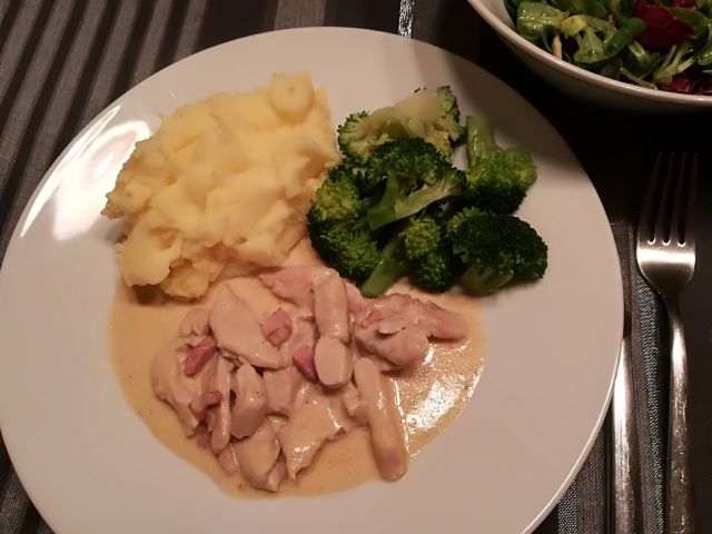 danes puranji koščki v omaki s slanino in parmezanom, pire krompir, na pari kuhan brokoli in mešana solata