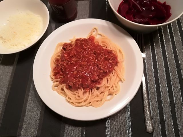 danes špageti, mesna omaka in pesa v solati