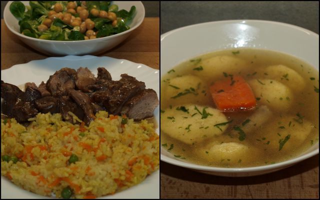 Goveja juhica s knedlčki; puranje bedro, vinska omaka, riž z grahom in korenčkom; motovilec s čičeriko