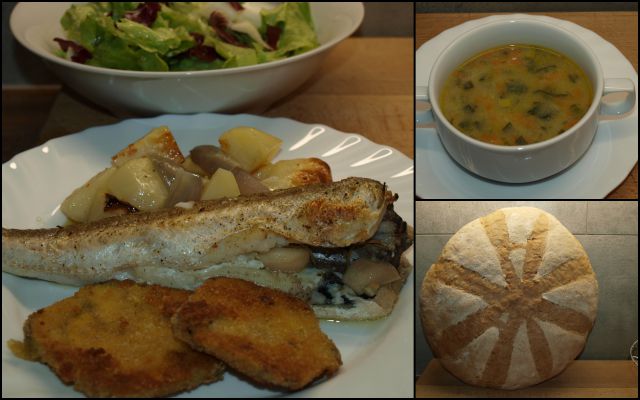 Zdrobovo-porova juhica; pečen oslič s krompirjem in šalotko, panirani malancani; mešana solata; domač kruh premera 33 cm ![]()