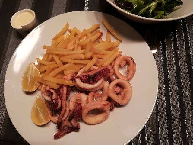 danes ocvrti kalamari, pomfri iz pečice, tatarska omaka in mešana solata