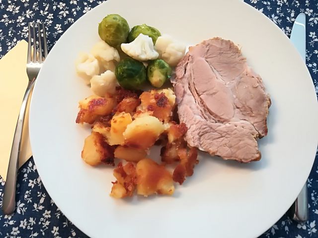 danes goveja juha z ribano kašo, svinjska pečenka, pečen krompir, na pari kuhana zelenjava, mešana solata in nedomači krofi