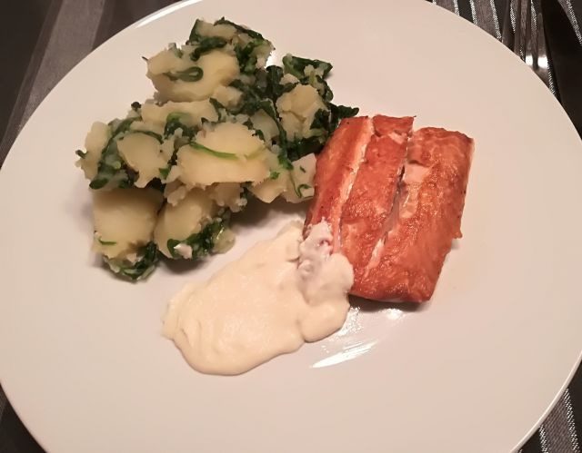 danes popečen file lososa, krompir z mlado špinačo in hrenova omakca