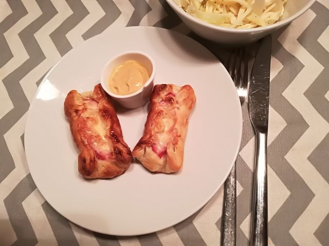 danes hrenovke s sirom v listnatem testu in zeljna solata s krompirjem