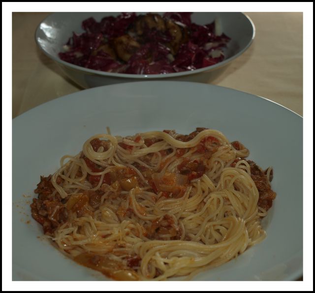 Špageti bologneze; rdeč radič, pečeni malancani, ocvirki