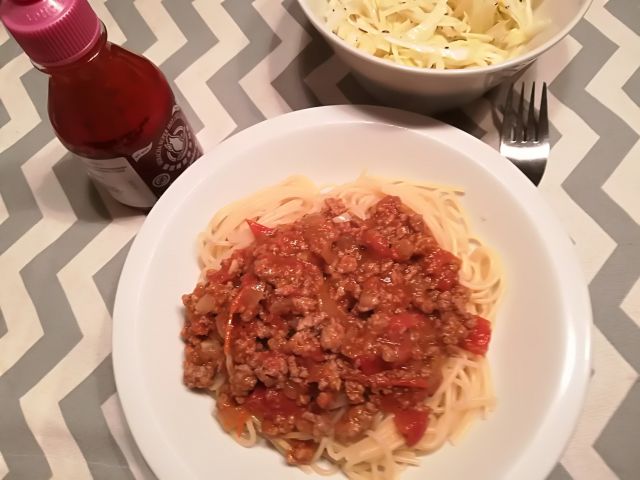 danes mesna omaka iz češnjevih paradižnikov, špageti in zeljna solata