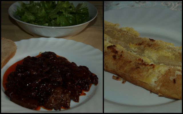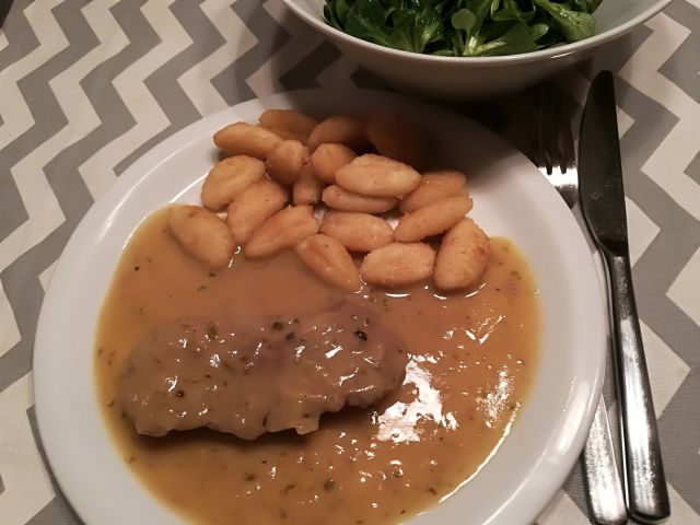 danes goveji zrezki v omaki, njoki na drobtinah in motovilec v solati
