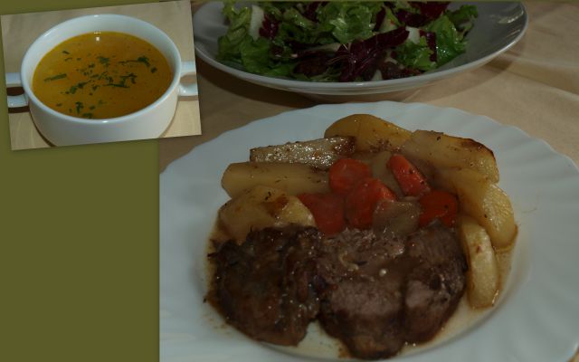 Zdrobovo-korenčkova juhica; pečen jagenjček s krompirjem in korenčkom; mešana solata