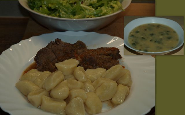 Krompirjevo-porova juhica; reciklaža jagenjčka od včeraj, domači njoki; zelena solata