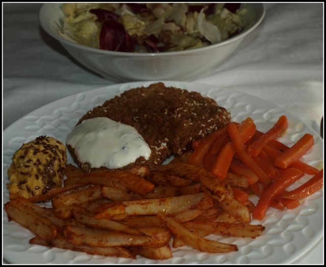 Panirana vratovina, pomfri (v pečici), karameliziran korenček, jogurt/majoneza, mešana solata: