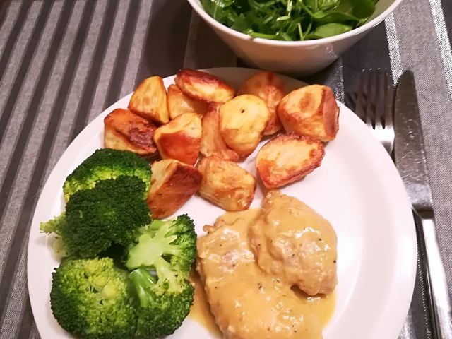 danes piščančja stegna v gorčični omaki, pečen krompir, na pari kuhan brokoli in rukola z mlado špinačo v solati