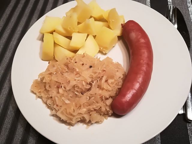 danes kislo zelje, kuhan krompir in kuhana klobasa