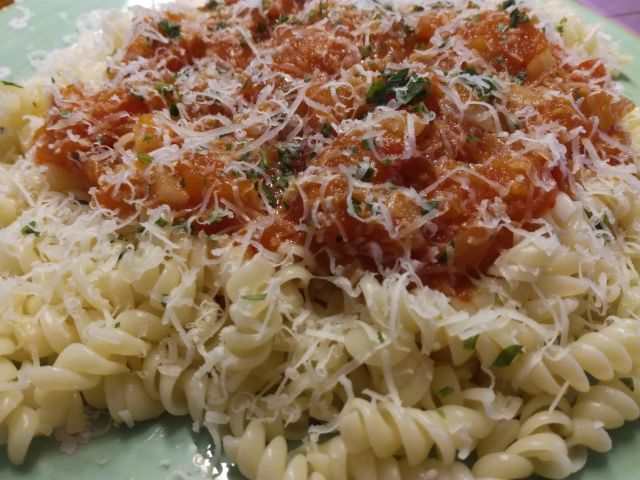 Danes pa špageti z faširano omako pa regrat s krompirjem.