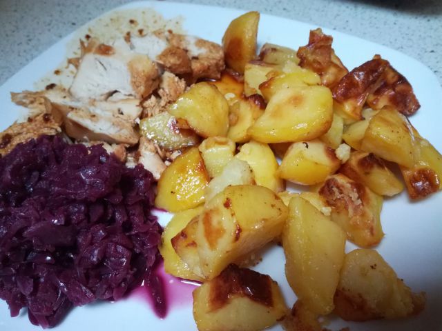 Danes kokošja juha z zvezdicami, pečen kos piščanca, pečen krompir, rdeče zelje z jabolki, rdeča pesa v solati, zeljna solata z zeleno solato