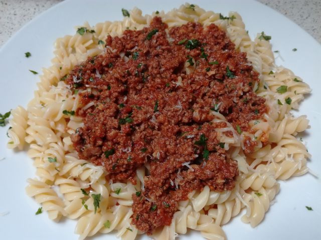 Fanta pa mesno omako, testenine in paradižnikovo solato.