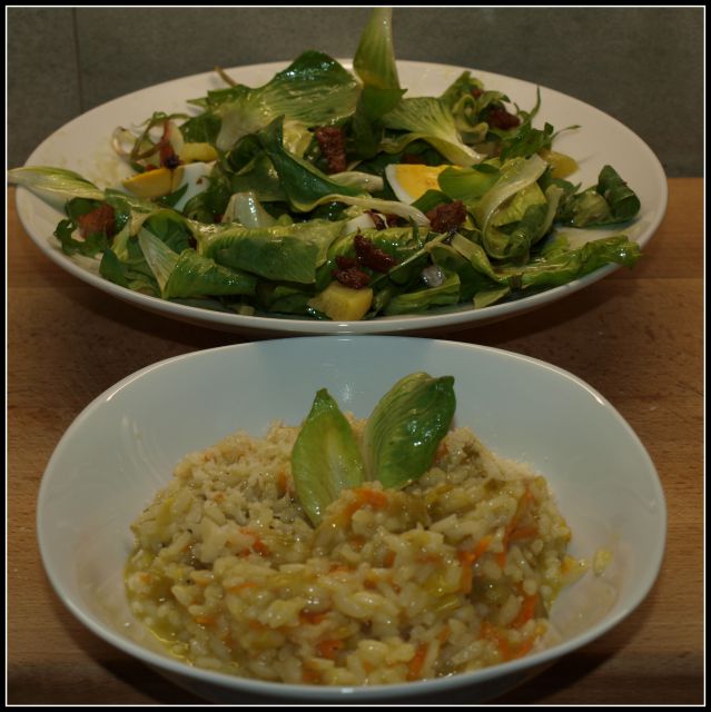Porova rižota; radič s krompirjem, jajcem in ocvirki