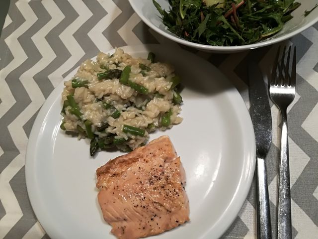 danes rižota s šparglji, popečen lososov file in regrat s krompirjem