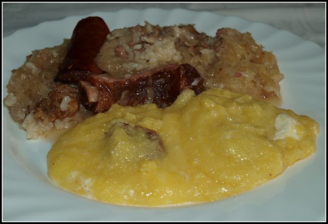Rusko zelje (klobasa, suha rebra, vratovina), polenta z ocvirki in feta-sirom