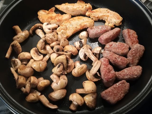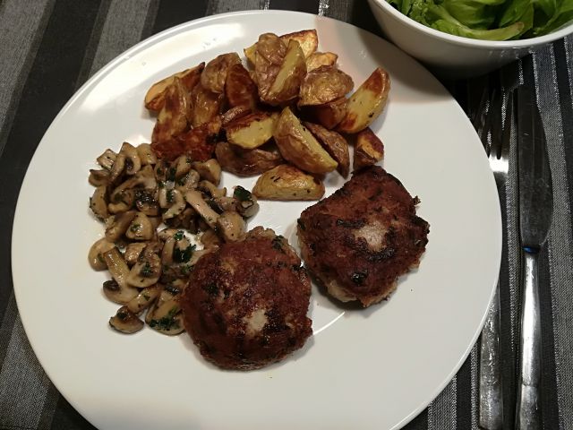 danes mesni polpeti, pečen mlad krompirček, popečeni šampinjoni in radič v solati