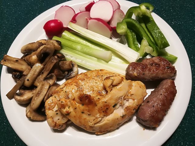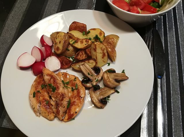 Popečeni piščančji fileji in šampinjoni, pečen mlad krompirček, redkvice in solata iz paradižnika, paprike in čebule