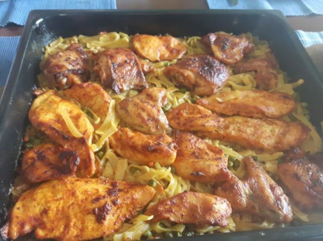 Spet pri nas, domači široki rezanci s piščancem in malo zelenjave, pečeno v pečici, prej pa begova čorba (imela še nekaj sušene okre):