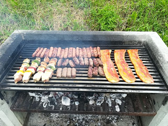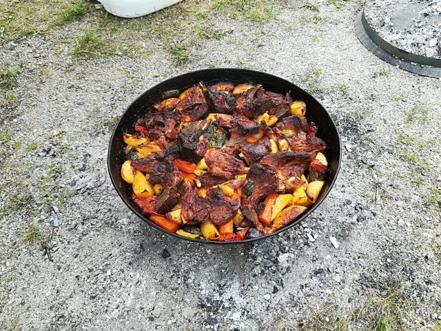danes smo imeli piknik, teletina z zelenjavo pod peko, čevapčiči, ražnjiči, slanina, mešana solata, kruh, cheesecake in čokoladno pecivo