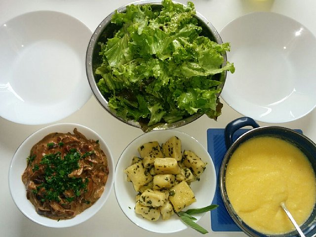 Skuhala sem gobovo omako, perfektno je uspela, njoke moje izdelave skuhala, odcedila in popekla na maslu, na katerem sem predhodno na hitro popražila nasekljan svež žajbelj, polento pa sem skuhala skupaj v vodi, ki sem ji dodala še malo mleka in seveda maslo. Solata pa je bila tudi luksuz, sveža domača, ki mi jo je dala mami. Sladica je bila pa prejšnji večer pečena pehtranova potička in kavica. Odžejala pa sva se potem še s pivom.