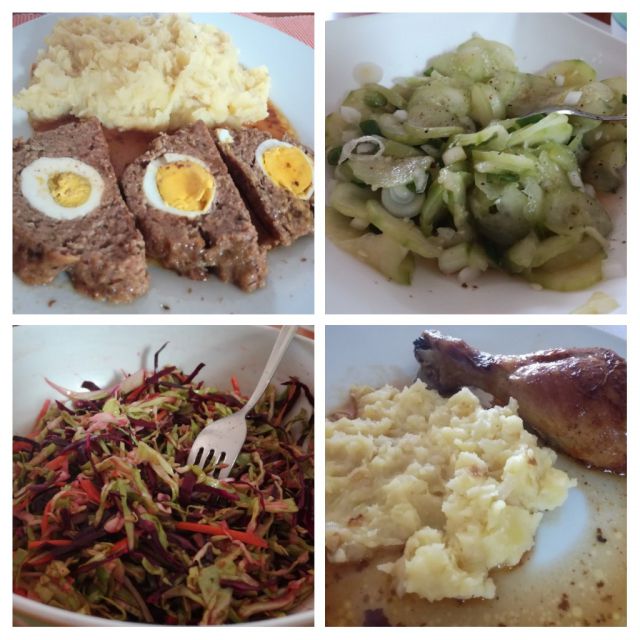 Danes stefani pečenka, zame piščančja kračka, pražen krompir, zeljna solata s korenjem, kumarična solata z mlado čebulo