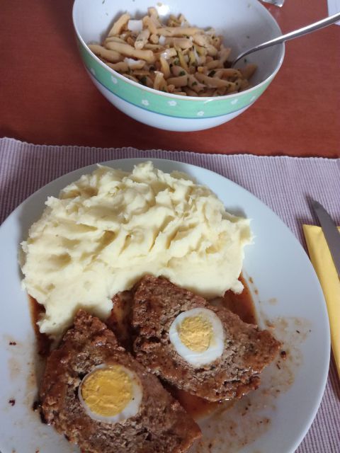 Danes ostanek stefani pečenke, pire krompir, stročji fižol v solati ( lanskoletni vložen)