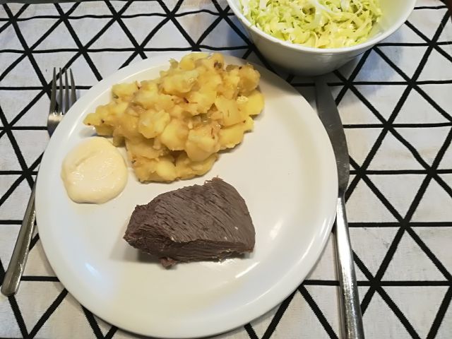Pri nama nedeljsko koslilo v soboto, goveja juha z vmešanim jajčkom, govedina iz juhe, tenstan krompir in zeljna solata