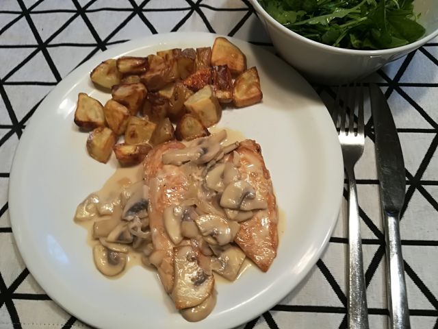 danes piščančji file s šampinjoni, pečen krompir in mešana solata
