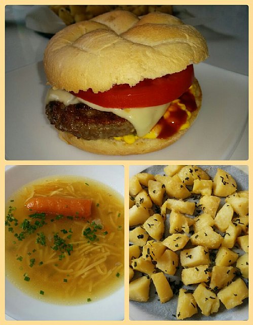 Goveja juha, hamburger, z dodatkom sicer kupljenih "omak", še zdaleč ne po standardu Masterchef-a (sem gledala oddajo in si rekla, to želim pripraviti), pa vseeno odličen! ter poleg še pečen krompir z žajbljem.