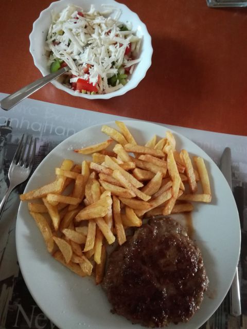 Danes domača pleskavica s čilijem, pomfri in šobska solata