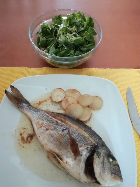 Moji so jedli zunaj, ker jim riba danes ne bi teknila... Jaz pa sem si spekla orado, odlična je bila in lepo se mi je smejala![]()