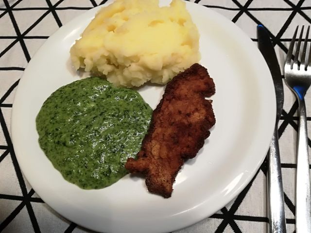 danes špinača, pire in ostanek puranjih dunajcev od včeraj