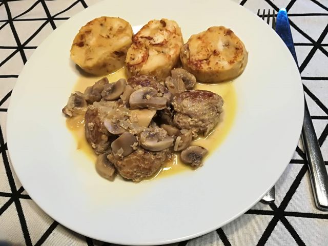 danes popečene rezine kruhove štruce, mesne kroglice s šampinjoni v omaki