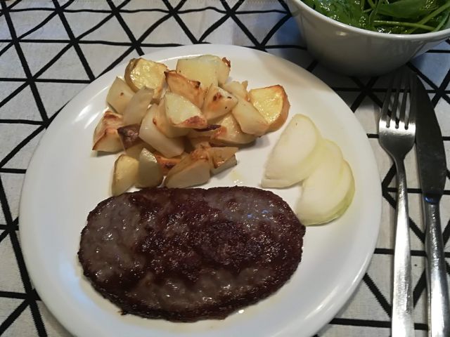danes pleskavica, pečen krompir in rukola s špinačo v solati