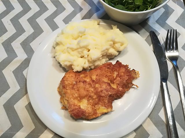 danes puranji file po pariško, pire krompir in rukola s špinačo v solati